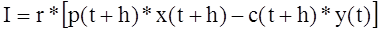 Если предприятие в момент t использует сырье и материалы y(t) по цене c(t) для производства продукта x(t+h), который реализуется по цене p(t+h) с временным лагом h (в месяцах), то в соответствии с практикой бухгалтерского учета фактическая величина налога на добавленную стоимость J будет равна: